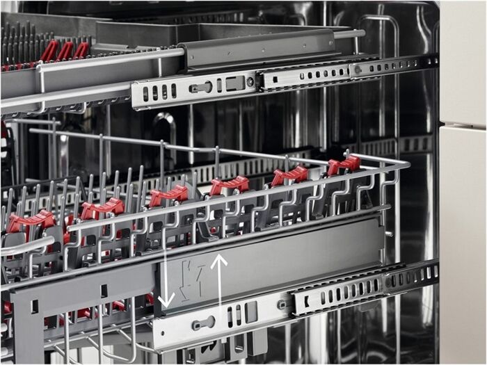 Wenn du einmal mehr Platz für sperriges Geschirr, zum Beispiel für Töpfe oder eine Salatschüssel benötigst, kann die Höhe des Oberkorbes an größere Gegenstände angepasst werden – das geht sogar, wenn der Geschirrspüler voll beladen ist.