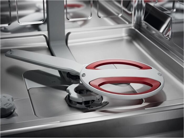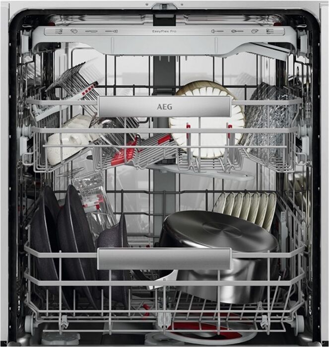 Hervorragende Reinigungsleistung und Wassereffizienz. Multifunktionale Körbe.AEG Geschirrspüler der Serie 9000 sind mit multifunktionalen, leichtläufigen Körben und Besteckschubladen sowie speziellen Halterungen für Gläser und Backbleche ausgestattet. Das hocheffiziente Wassersystem entfernt hartnäckige Speiserückstände bei einem geringen Wasserverbrauch von nur 8.4 Litern. Vielseitige Beladungsmöglichkeiten mit den EasyFlex Pro KörbenDie leichtläufigen EasyFlex Pro Körbe verfügen über vielseitig klappbare Bereiche und Zinken für maximale Flexibilität. SoftGrips und SoftSpikes® fixieren Stielgläser und verhindern Kollisionen. Die Besteckschublade bietet Platz für Schneebesen, Suppenkellen und kleine Tassen. 4in1 FlexHolder für Stielgläser, große Gläser sowie BackblecheDer 4in1 FlexHolder im Unterkorb verfügt über SoftGrips, die dank Anti- Rutsch-Technologie Wein- und Champagner-Gläser sowie große Gläser sicher während des Spülvorgangs halten. Backbleche können im richtigen Winkel fixiert werden, um hartnäckige Speiserückstände zu entfernen. SatelliteClean Pro: Effiziente Reinigung für hartnäckige SpeiserückständeDer SatelliteClean® Pro Sprüharm mit Doppelrotation erreicht jeden Winkel des Geschirrspülers – für eine 100%ige Entfernung selbst hartnäckiger Speiserückstände wie Eingebranntem in nur 90 Minuten*. Und das ganz ohne zusätzlichen Wasserverbrauch. Steuere Zeit und Verbrauch über das Display oder die AEG AppDas SmartSelect Connect Display und die AEG App zeigen dir jeweils die Dauer und Energieeffizienz jedes Programms an. Reinige Geschirr schnell im 60 Minuten Programm, oder spare Energie mit dem ECO Programm. Nutze die App für Tipps zur Beladung, zu Programmen und zur Maschinenpflege.  ZoneClean: Leistungsstark für Töpfe und Pfannen, sanft zu Gläsern Aktiviere ZoneClean, um den Wasserdruck des Sprüharms im Unterkorb für Töpfe und Pfannen zu maximieren und zeitgleich Gläser im Oberkorb sanft zu reinigen. So entstehen zwei separate Reinigungszonen, ohne zusätzlichen Wasser- oder Energieverbrauch.