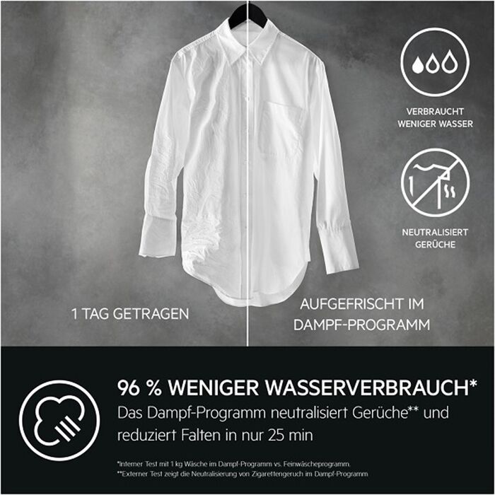 Mit dem Dampf-Programm erhältst du das Frisch-Gewaschen-Gefühl in 25 Min. Gerüche werden neutralisiert und vorhandene Falten reduziert. Das spart dir und der Umwelt die Zeit & Energie eines vollständigen Waschgangs und benötigt dabei nur 2 L Wasser. Für einen zusätzlichen Frische-Effekt füge einfach unseren Steam Fragrance hinzu. ProSteam Dampf-Programm: Auffrischen statt Waschen. Mit 96 % weniger Wasserverbrauch*