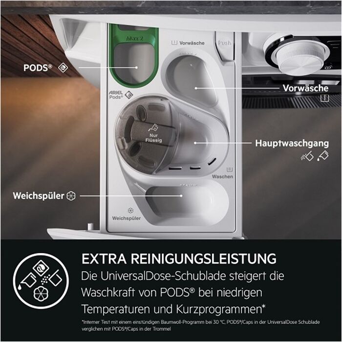 • UniversalDose Schublade für alle Waschmittelarten, sogar Waschmittel-PODS®/Caps