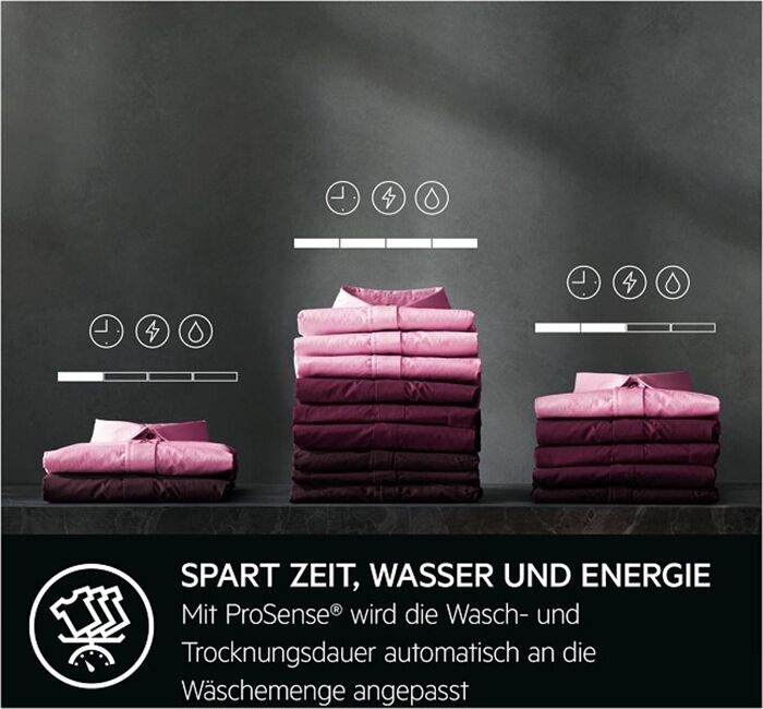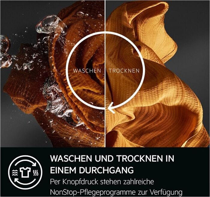 Schonendes Trocknen bei halber Temperatur*Der 9000 AbsoluteCare® Waschtrockner trocknet deine Kleidung bei halber Temperatur*, dank fortschrittlichster Wärmepumpentechnologie. Maßgeschneiderte Trommelbewegungen waschen und trocknen Wolle, Outdoor-Bekleidung und sorgen sogar dafür, dass empfindliche Seidenstoffe ihre Form behalten.** Schonend und gleichzeitig effizient, sowohl beim Waschen als auch beim Trocknen.Schonendes Trocknen bei halber Temperatur**Basierend auf internen Tests, bei denen die maximale Lufttrommeleintrittstemperatur von Wärmepumpen- und herkömmlichen Kondensationswaschtrocknern verglichen wurde. **Im Vergleich zur Lufttrocknung. WÄRMEPUMPE: NIEDRIGTEMPERATUR-TROCKNUNG, REDUZIERTER ENERGIEVERBRAUCH UM BIS ZU 55 %Die Wärmepumpentechnologie trocknet deine Kleidung bei halber Temperatur*, schützt sie vor unnötiger Hitze und reduziert den Energieverbrauch um bis zu 55%**. Diese Technologie ermöglicht die Energieeffizienzklasse B für den Non-Stop-Wasch+Trocken-Zyklus.WÄRMEPUMPE: NIEDRIGTEMPERATUR-TROCKNUNG, REDUZIERTER ENERGIEVERBRAUCH UM BIS ZU 55 %***Basierend auf internen Tests, bei denen die maximale Lufttrommeleintrittstemperatur von Wärmepumpen- und herkömmlichen Kondensationswaschtrocknern verglichen wurde. **Basierend auf internen Tests, bei denen der Energieverbrauch der Trocknungsphase von Wärmepumpen- und herkömmlichen Kondensationswaschtrocknern im vollständigen Eco 40-60-Zyklus bei maximaler Beladung (6 kg IEC-Baumwolle) verglichen wurde. SpecialCare Wash-to-Dry: Waschen und Trocknen ohne UnterbrechungMit SpecialCare Wash-to-Dry entscheidest du mit nur einem Tasten-Druck, ob dein gewähltes Waschprogramm* anschließend automatisch in das passende Trockenprogramm wechselt. Selbst Wolle, Feines und Outdoorkleidung werden optimal gepflegt und schonend getrocknet.  ProSense®+: Nutzung der Programmkapazität bei minimalem Waschmittelverbrauch Die Gewichtssensoren von ProSense®+ geben dir während des Befüllens exaktes Feedback zur Unter- bzw. Überladung der Trommel und empfehlen dir die entsprechende Menge an Waschmittel über das Display. Das Gerät passt den Strom-, Wasser- und Zeitverbrauch automatisch an die Wäschemenge an. AEG App: Bedienkomfort ohne GrenzenDu hast es in der Hand: Schalte deinen Waschtrockner von überall ein, erhalte individuelle Pflegetipps für ein optimales Ergebnis oder werde benachrichtig, sobald deine Wäsche fertig ist.  NonStop 3h/3kg- Programm: 3 kg waschen und trocknen in 3 StundenDas Nonstop 3h/3kg-Proamm ermöglicht es dir, mit nur einem Knopfdruck deine Wäsche in kürzester Zeit zu waschen und zu trocknen. Damit du deine Lieblingskleidungsstücke direkt wieder anziehen kannst.