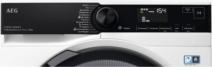 AEG Wäschetrockner der Serie 9000 mit AbsoluteCare® PlusDie 9000 AbsoluteCare® Plus Wäschetrockner mit 3D-Scan-Technologie ermitteln die Restfeuchte tief im Gewebe, wodurch selbst mehrlagige Textilien höchst präzise, vollständig und gleichmäßig getrocknet werden, damit Kleidungsstücke und Daunenjacken schön flauschig und warm bleiben. 3D-Scan: Daunenjacken so flauschig und warm wie am ersten Tag*Die 3D-Scan-Technologie sorgt für äußerst schonende und höchst präzise Trockenergebnisse. Sie misst die Restfeuchtigkeit tief im Gewebe und passt die Trockenleistung automatisch an. Du kannst sicher sein, dass alle deine Wäschestücke gleichmäßig trocknen - sogar Daunenjacken und Bettdecken.3D-Scan: Daunenjacken so flauschig und warm wie am ersten Tag**Basierend auf externen Tests zur Prüfung der Wärmebeständigkeit von Textilien getrocknet mit 3D-Scan-Technologie, durchgeführt gemäß ISO 11092. AbsoluteCare®: Garantiert kein Einlaufen - auch bei Wolle und Seide*AbsoluteCare® nutzt die Wärmepumpentechnologie zusammen mit präzise gesteuerten Trommelbewegungen, um selbst deine empfindlichsten Kleidungsstücke schonend zu trocknen. Wolle läuft nicht ein, Seide bleibt in Form und sogar die Imprägnierung deiner Outdoor-Bekleidung wird wieder hergestellt. AbsoluteCare®: Garantiert kein Einlaufen - auch bei Wolle und Seide**Vergleichbar mit liegend getrockneter Wolle. MixDry Programm: Kein Vorsortieren. Kein Aufwand.MixDry trocknet deine Kleidungsstücke aus Synthetik und Baumwolle sorgfältig, gleichmäßig und mit der exakt richtigen Temperatur – nicht zu trocken, nicht zu feucht. Ganz ohne Vorsortieren. Die Wärmepumpentechnologie sorgt für das exakte Maß an Temperatur und spart dabei noch Energie.MixDry Programm: Kein Vorsortieren. Kein Aufwand.*Getestet mit einer Mischladung von bis zu 5 kg aus Baumwolle und Synthetik. Das Swissatest zertifizierte Hygiene-Programm beseitigt 99,9 % der Bakterien und Viren*Das Hygiene-Programm trocknet bei 60 °C über einen konstanten Zeitraum und entfernt dadurch 99,9 % der Bakterien und Viren* in der Wäsche.Das Swissatest zertifizierte Hygiene-Programm beseitigt 99,9 % der Bakterien und Viren**Getestet auf Candida albicans, MS2 Bakteriophagen und Escherichia coli in einer externen Untersuchung der Swissatest Testmaterialien AG im Jahr 2021 (Testbericht Nr. 20212038). SensiDry®: weniger Energieverbrauch und gleichmäßige Trocknung deiner KleidungBei der SensiDry®-Wärmepumpentechnologie kommen präzise Sensoren zum Einsatz, die für gleichmäßige Trockenergebnisse sorgen - bei niedrigen Temperaturen. Deine Textilien werden geschont und du sparst Energie.