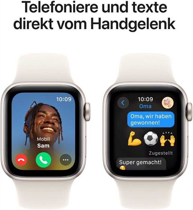 Wenn Sie Produktbilder der Apple Watch SE (GPS + Cellular) verwenden, fügen Sie bitte die folgenden rechtlichen Hinweise hinzu (gilt nicht für Außenwerbung): Armbänder nur zur Illustration und vorbehaltlich der Verfügbarkeit. Die Apple Watch SE erfordert ein iPhone Xs oder neuer mit iOS 18 oder neuer. Für Mobilfunkdienste ist ein Mobilfunktarif erforderlich. Weitere Infos gibt es beim jeweiligen Mobilfunkanbieter. Die Verbindung kann abhängig von der Netzwerk-Verfügbarkeit variieren. Informationen über teilnehmende Mobilfunkanbieter und die Verfügbarkeit gibt es unter apple.com/de/watch/cellular. Zusätzliche Anleitungen zum Einrichten findest du unter support.apple.com/de-de/HT207578.