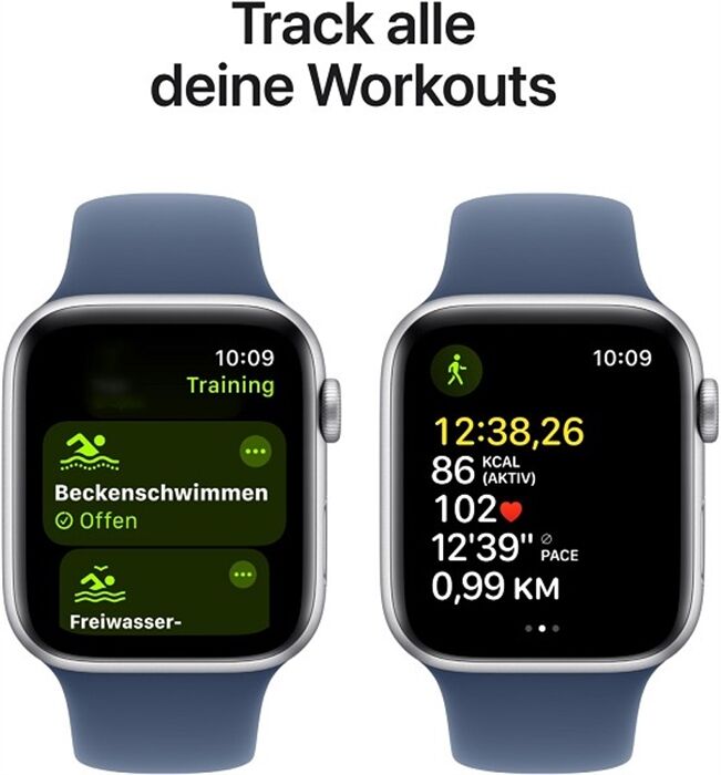 ⁸ Die Apple Watch SE ist wassergeschützt bis 50 Meter nach ISO Norm 22810:2010. Das bedeutet, sie ist für Aktivitäten in flachem Wasser wie Schwimmen in einem Pool oder im Meer geeignet. Die Apple Watch SE sollte nicht beim Sporttauchen, Wasserski oder bei anderen Wasseraktivitäten mit hohen Geschwindigkeiten oder in tieferem Wasser verwendet werden. Wasserschutz ist kein dauerhafter Zustand und kann im Laufe der Zeit abnehmen. Weitere Infos findest du unter support.apple.com/de-de/HT205000.