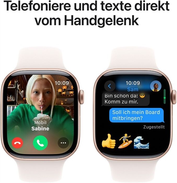 • Hör Musik und Podcasts, verwende Siri und erhalte Mitteilungen. Die Apple Watch Series 10 (GPS) funktioniert mit deinem iPhone und im WLAN, damit du in Verbindung bleibst.
