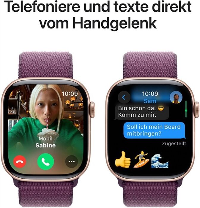• Hör Musik und Podcasts, verwende Siri und erhalte Mitteilungen. Die Apple Watch Series 10 (GPS) funktioniert mit deinem iPhone und im WLAN, damit du in Verbindung bleibst.