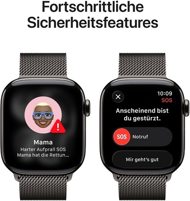 ² Datentarif erforderlich. 5G ist in ausgewählten Ländern und über ausgewählte Anbieter verfügbar. Die Geschwindigkeit kann je nach Standort und Anbieter variieren. Nähere Informationen zur 5G Unterstützung gibt es beim jeweiligen Mobilfunkanbieter und auf apple.com/de/watch/cellular.