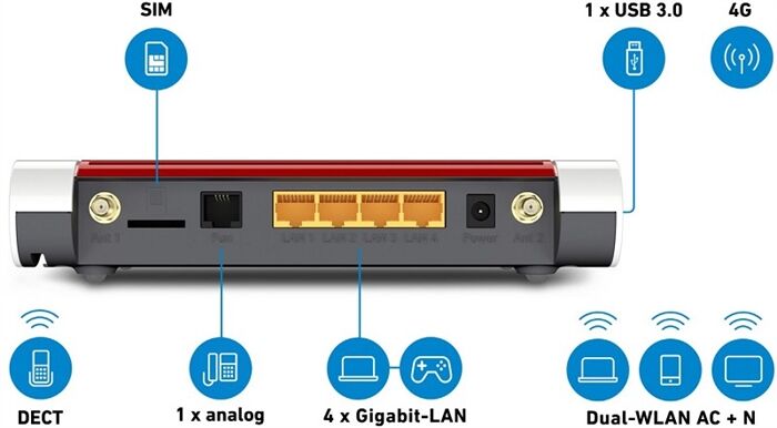 • 1 analoger Anschluss, 1 SIM-Karten-Slot (Mini-SIM), 2 SMA-Anschlüsse zum Anschrauben von Mobilfunkantennen
