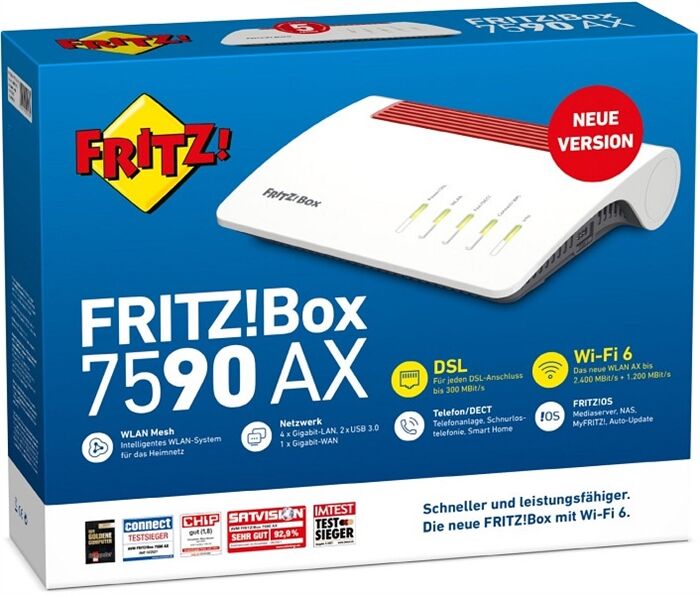Die FRITZ!Box 7590 AX mit innovativem Wi-Fi 6 (WLAN AX) bringt ultraschnelles WLAN ins Heimnetz. Der Standard Wi-Fi 6 (WLAN AX) ist nochmals schneller und deutlich effizienter: mehrere parallele Anwendungen wie 4K-Streams, Video-Konferenzen und Cloud- Anwendungen meistert die FRITZ!Box 7590 AX mühelos. Ausgestattet mit zukunftssicherem VDSL Supervectoring 35b ermöglicht die FRITZ!Box Internetgeschwindigkeiten von bis zu 300 MBit/s am Anschluss. Gigabit-LAN, USB 3.0 und die DECT-Basis für schnurlose Telefonie und Smarthome-Anwendungen komplettieren das vielseitige Kommunikationsangebot im Heimnetz ab.