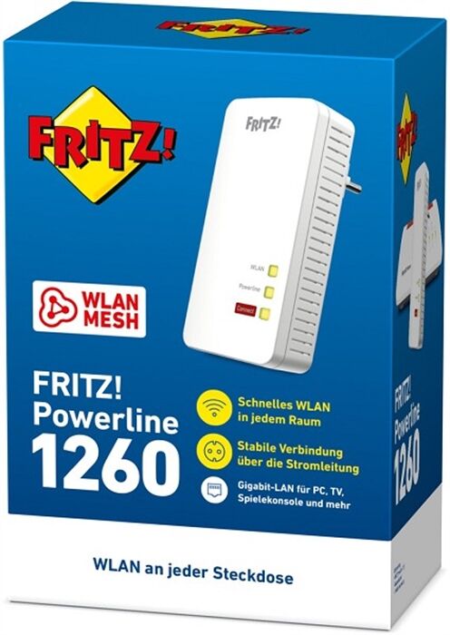 FRITZ!Powerline 1260 erweitert das WLAN im Heimnetz mit Gigabit-Tempo. Das WLAN kann so komfortabel, sicher und flexibel über Powerline auch in Räumen mit großem Abstand zum Router bereitgestellt werden. Das Gerät ist vorbereitet für WLAN Mesh einer installierten FRITZ!Box. Mit maximaler Sicherheit per WPA2-Verschlüsselung, einfacher Anbindung von WLAN-Geräten per WPS (Wi-Fi Protected Setup ) sowie Datenraten von bis zu 866 MBit/s (WLAN AC) + 400 MBit/s (WLAN N), bietet FRITZ!Powerline 1260 viel Komfort und Flexibilität beim kabellosen Surfen.