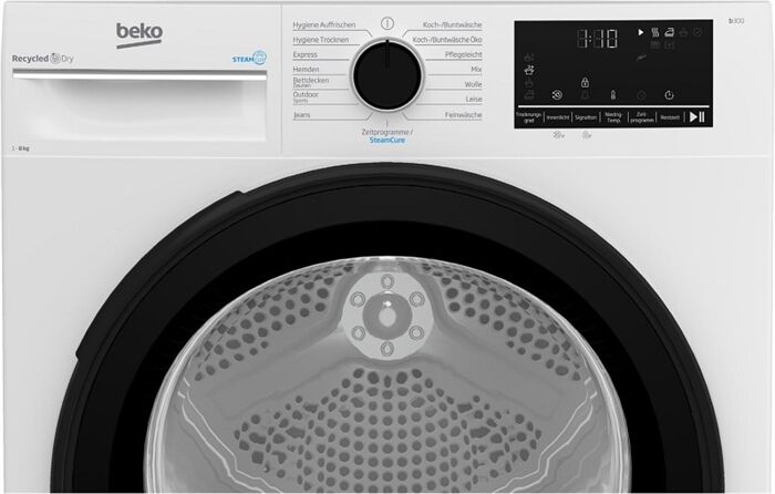 Leistungseigenschaften - Angabe gemäß EU-Verordnung 2023/2534 - Fassungsvermögen Trockenwäsche (kg): 8 - Trockner-Typ: Kondensation - Energieeffizienzklasse: Energieeffizienzklasse C - Energieeffizienzspektrum: Spektrum [A bis G] - gew. Energieverbrauch/100 Zyklen in kWh: 102 - gemessen bei Programm: gemessen bei Eco Programm - Programmdauer Eco (Min): 174 - Kondensationseffizienzklasse : Kondensationseffizienzklasse B - gewichtete Kondensationseffizienz: * %: 88 - Luftschallemissionsklasse: Luftschallemissionsklasse B - Betriebsgeräusch (dBA): 64 - Inverter-Technologie - 220-240V 50/60Hz Netzanschluss Automatik-Funktionen - Wärmepumpe - elektr. Feuchtigkeitsmessung Bedienung - Programmwahl: Ein-Knopf-Programmwahl - Start-Taste - Schon-Taste für niedrigere Temperaturen - Restzeitanzeige: Restzeitanzeige - Luftweg-Reinigungsanzeige - Flusensieb-Kontrolle: opt. Signal zur Flusensiebreinigung - Kondenswasser-Behälterkontrolle: opt. Wasserentleerungs-Signal - Programmende-Signal: akustisches Programmende-Signal - Display-Anzeige - Kindersicherung Programme - Anzahl Trocken-Programme: 15 - Baumwolle-Programm - Pflegeleicht-Programm - Fein-Programm - Woll-Programm - Große Wäschestücke-Programm - Jeans-Programm - Blusen/Hemden-Programm - Mischwäsche-Programm - Outdoor-/ Sport-Programm - Hygiene-Programm - Nacht-Programm - Schnelltrocknungs-Programm - Energiespar-Programm - Zeitwahl-Programme - Feinabstufungen innerhalb der Programme Trommel-/Trocken-Eigenschaften - Trommel-Material: Edelstahl-Trommel - LED-Innenraum-Beleuchtung - Trommel mit Links-/Rechtsdrehung Gehäuse-Eigenschaften - Breite (cm): 59.8 - Höhe (cm): 84.6 - Tiefe (cm): 60.5 - Kondenswasser-Behälter in der Blende Farben - Gehäuse-Farben: weiß