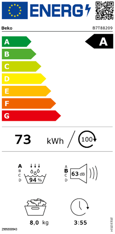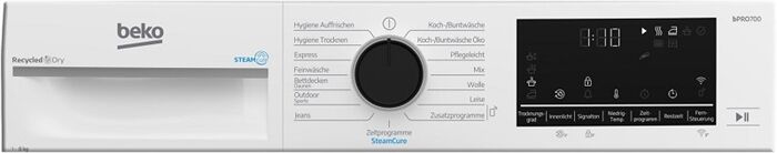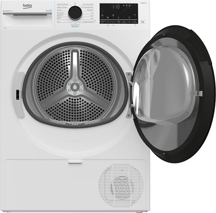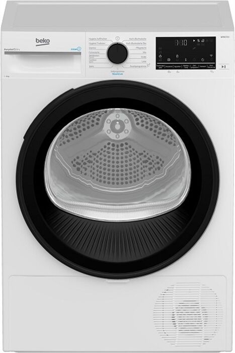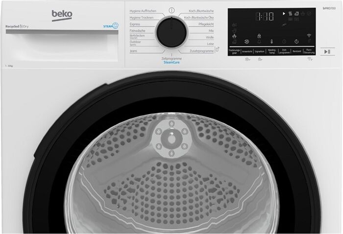 Leistungseigenschaften - Angabe gemäß EU-Verordnung 2023/2534 - optionale Smart Home Funktion - steuerbar über App - Funktionserweiterung über Apps - steuerbar über Smartphone/Tablet - Anschlusswert (kW): 0.6 - Fassungsvermögen Trockenwäsche (kg): 8 - Trockner-Typ: Kondensation - Energieeffizienzklasse: Energieeffizienzklasse A - Energieeffizienzspektrum: Spektrum [A bis G] - gew. Energieverbrauch/100 Zyklen in kWh: 73 - Steuerung der Trocknung: Trocknungsgradregelung autom./Zeitwahl - gemessen bei Programm: gemessen bei Eco Programm - Leistungsaufnahme, Netz-Aus (W): 0.5 - Leistungsaufnahme, Stand-By (W): 0.5 - Programmdauer Eco (Min): 235 - Kältemittelart: R 290 - Kondensationseffizienzklasse : Kondensationseffizienzklasse A - gewichtete Kondensationseffizienz: * %: 94 - Luftschallemissionsklasse: Luftschallemissionsklasse B - Betriebsgeräusch (dBA): 63 - Elektronische Steuerung - Inverter-Technologie - Absicherung: 10 A Absicherung - max. Stromstärke (A): 3.5 - 220-240V 50/60Hz Netzanschluss Automatik-Funktionen - Wärmepumpe - elektr. Feuchtigkeitsmessung - Knitterschutz Bedienung - Programmwahl: Ein-Knopf-Programmwahl - Ein-/Aus-Taste - Start-/Pause-Taste - Schon-Taste für niedrigere Temperaturen - Dampf-Funktion - Start-Vorwahl - max. vorprogrammierbare Startzeit (Std.): 24 - Restzeitanzeige: Restzeitanzeige - Wärmetauscher-Kontrollanzeige - Flusensieb-Kontrolle: opt. Signal zur Flusensiebreinigung - Kondenswasser-Behälterkontrolle: opt. Wasserentleerungs-Signal - Programmanzeige: Programm-Ablaufanzeige - Programmende-Signal: akustisches Programmende-Signal - Fernstart - Display-Anzeige - Kindersicherung Programme - Anzahl Trocken-Programme: 15 - Koch-/Buntwäsche-Programm - Extra-Trocken-Programm - Sehr-Trocken-Programm - Schranktrocken-Programm - Bügelfeucht-Programm - Pflegeleicht-Programm - Fein-Programm - Woll-Programm - Lüften-Programm - Große Wäschestücke-Programm - Jeans-Programm - Mischwäsche-Programm - Outdoor-/ Sport-Programm - Hygiene-Programm - Nacht-Programm - Schnelltrocknungs-Programm - Energiespar-Programm - Zeitwahl-Programme Trommel-/Trocken-Eigenschaften - Trommel-Material: Edelstahl-Trommel - Trommel-Innenbeleuchtung - Trommel mit Links-/Rechtsdrehung - Trommel-Struktur: Schontrommel Gehäuse-Eigenschaften - Breite (cm): 59.8 - Höhe (cm): 84.6 - Tiefe (cm): 67.2 - Leergewicht (kg): 45 - Bullauge - Anschlagseite der Tür: Rechts-Anschlag der Tür - Tür-Anschlag wechselbar - Säulenfähigkeit: säulenfähig - höhenverstellbare Gerätefüße - Flusensieb in der Türöffnung - Kondenswasser-Behälter in der Blende - Direkter Kondenswasserablauf möglich - Wasserablauf über Schlauch - Länge der Anschlussleitung (cm): 150 Verpackungsangaben - Breite mit Verpackung (cm): 65 - Höhe mit Verpackung (cm): 88.5 - Tiefe mit Verpackung (cm): 69 - Gewicht mit Verpackung (kg): 46 Farben - Gehäuse-Farben: weiß