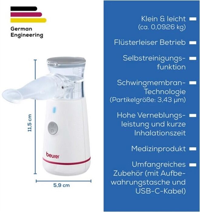 • Zubehör: Mesh-Vernebler mit Medikamenten-Behälter, Mundstück, Erwachsenenmaske, Kindermaske, Aufbewahrungstasche und USB-C-Kabel