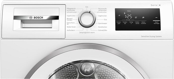 • Spezialprogramme: Wolle finish, Schnell/Mix, Handtücher, Zeitprogramm warm, Auflockern, Sportswear, Extra Kurz 40', Blusen/Hemden