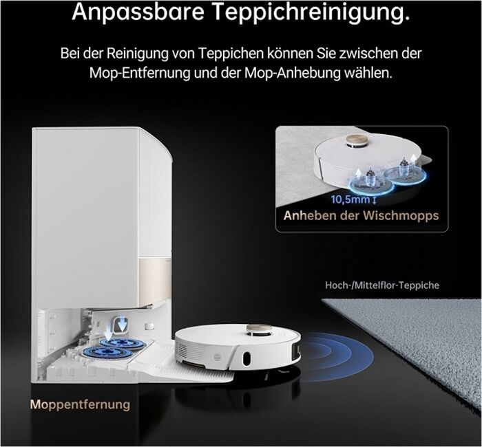 Durch die Kombination von Ultraschall-Teppicherkennung und fortschrittlicher Moppenfernungstechnologie wird die Reinigung von Teppichen und Läufern signifikant verbessert.