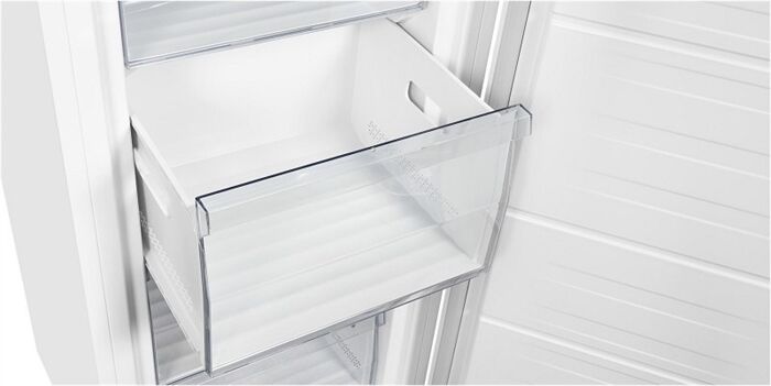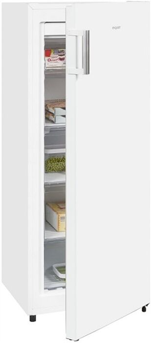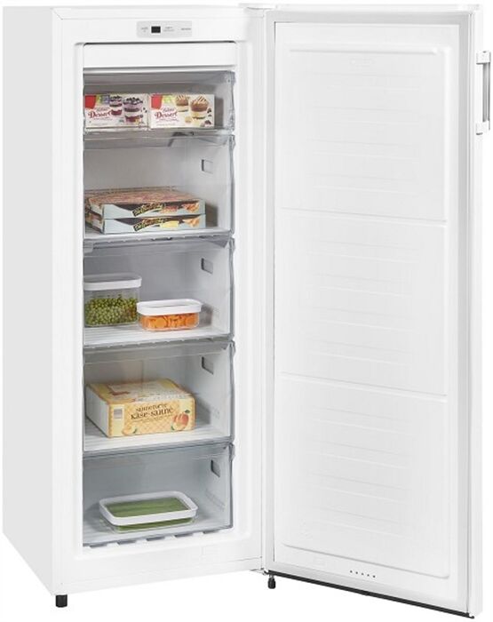 Verbrauchs-Eigenschaften - Angabe gem. EU-Verordnung 2019/2016 - Energieeffizienzklasse: Energieeffizienzklasse E - Energieeffizienzspektrum: Spektrum [A bis G] - Energieverbrauch in kWh/Jahr: 205 - 220-240V 50/60Hz Netzanschluss - Stromaufnahme (A): 0.8 Leistungseigenschaften - Anschlusswert (W): 100 - Klimaklasse: Klimaklasse SN/T - Gefrierfach-Kennzeichnung: 4-Sterne-Gefrierschrank - Gefriervermögen in 24 Std. (kg): 8 - Lagerzeit bei Störung (Std.): 9.8 - Nutzinhalt Gefrierraum (l): 155 - Super-Gefrier/Super-Frost-Funktion - No-Frost-Technik gegen Vereisung - elektronische Temperaturregelung - Geräusch-Schallleistung (dB): 41 - Geräuschemissionsklasse: Geräuschemissionsklasse C Bedienung - Temperaturanzeige: Temperaturanzeige innen - Art der Temperaturanzeige: Temperatur-Digital-Anzeige - wählbare Temperatur - Tür offen-Warnsignal: Tür offen-Warnsignal - Abtauverfahren: Abtauautomatik Gefrierraum-Eigenschaften - Umluft-Kühlen - Anzahl Fächer/Schubladen, gesamt: 5 - Glas-Ablagefläche - Anzahl der Gefrierschubladen: 4 - Anzahl der Gefrierfächer mit Klappe: 1 - transparente Schubfächer Gehäuse-Eigenschaften - Breite (cm): 56 - Höhe (cm): 143.5 - Tiefe (cm): 56.5 - Tiefe einschl. Wandabstand (cm): 66.5 - Tiefe bei geöffneter Tür (cm): 107 - Leergewicht (kg): 43 - Länge der Anschlussleitung (cm): 210 - Anschlagseite der Tür: Rechts-Anschlag der Tür - Tür-Anschlag wechselbar - Stellfüße vorn - höhenverstellbare Gerätefüße - Gehäuse hinten mit Rollen Verpackungsangaben - Breite mit Verpackung (cm): 58 - Höhe mit Verpackung (cm): 149.8 - Tiefe mit Verpackung (cm): 58 - Gewicht mit Verpackung (kg): 47 Farben - Gehäuse-Farben: weiß