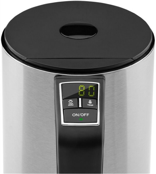 Leistungseigenschaften - Leistung (W): 2200 - 220-240V 50/60Hz Netzanschluss - Fassungsvermögen (l): 1.5 - Anzahl der Temperaturstufen: 14 - min. Temperatur (°C): 35 - max. Temperatur (°C): 100 - automatische Koch-Abschaltung - akustisches Fertig-Signal - Warmhalte-Funktion - Trockengehschutz Bedienung - Kabel: kabellos mit separatem Aufheizsockel - Aufheizsockel ohne Kannenfixierung - Art der Temperaturanzeige: Temperaturanzeige - Ein-/Aus-Schalter - Kontrollleuchte - autom. Deckelöffnung per Knopfdruck Gehäuse-Eigenschaften - Gehäuse-Material: Edelstahl-Topf Farben - Gehäuse-Farben: edelstahl