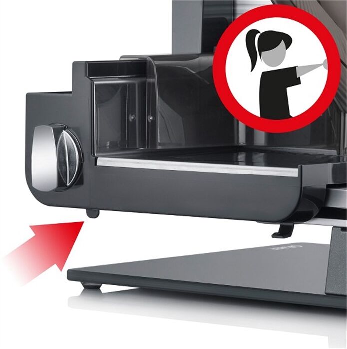 • Schlittenschaltung mit Moment- und Dauerfunktion, Dauerschalter, EinfacheMesserabnahme, Leistungsstarker Motor, Momentschalter, Kindersicherung durchEinschaltsicherung