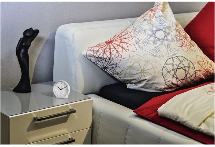 Stromversorgung - Batterie-Betrieb Bedienung - Uhren-Typ: Funkuhrgesteuert/DCF 77 - Snooze-Funktion - Uhrzeit funkgesteuert Anzeige - Analog-Ziffernblatt - Anzahl Weckzeiten: 1 - Ziffernblatt: Ziffernblatt-/Displaybeleuchtung Gehäuse-Eigenschaften - Breite (cm): 10.5 - Höhe (cm): 10.5 - Tiefe (cm): 5.1 - Gehäuse-Material: Kunststoff-Gehäuse Farben - Gehäuse-Farben: weiß