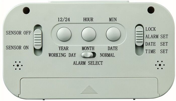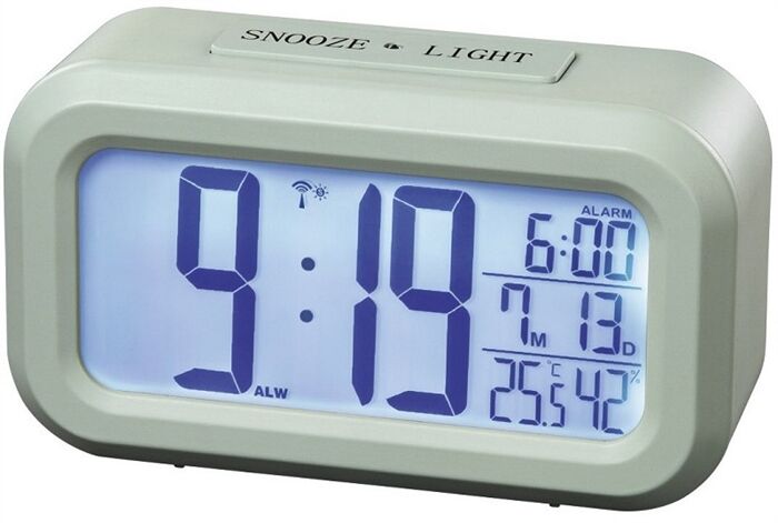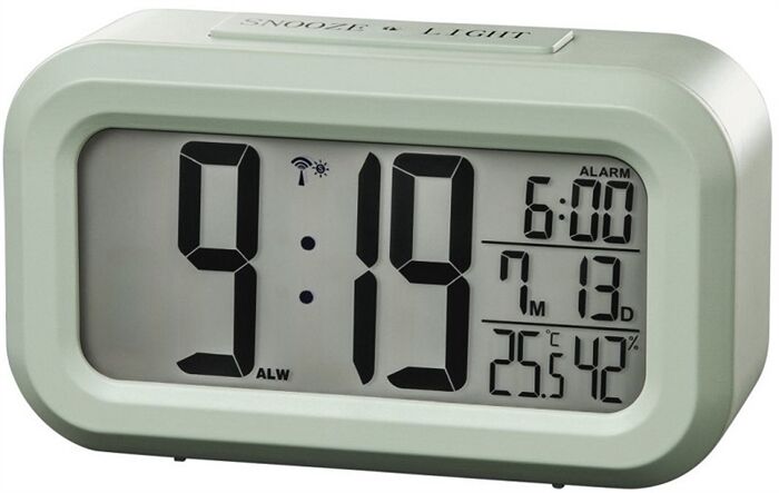 Stromversorgung - Batterie-Betrieb Bedienung - Uhren-Typ: Funkuhrgesteuert/DCF 77 - Snooze-Funktion - Uhrzeit funkgesteuert Anzeige - Digital-Anzeige - beleuchtetes Display - 12/24-Std.-Anzeige - Helligkeit regelbar - Datum-Anzeige - Anzahl Weckzeiten: 2 - Digital-Anzeige für Weckzeit - Temperaturanzeige - Temperaturanzeige umschaltbar auf ° F - Anzeige der Luftfeuchtigkeit - integrierter Licht-Sensor Gehäuse-Eigenschaften - Breite (cm): 11.8 - Höhe (cm): 6.5 - Tiefe (cm): 4 - Gehäuse-Material: Kunststoff-Gehäuse Farben - Gehäuse-Farben: grün