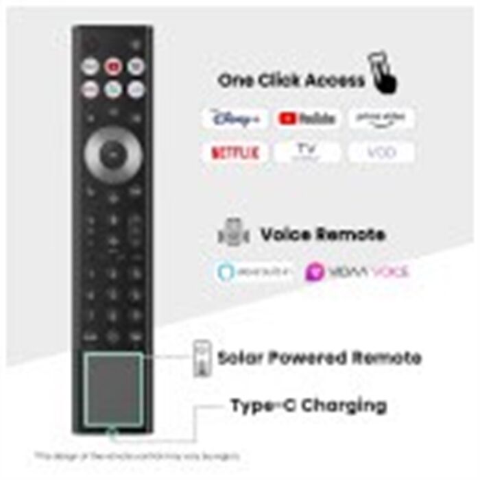 Höchsten Komfort bieten die Sprachassistenten Alexa Built-In oder VIDAA Voice, die sich per Knopfdruck auf der Fernbedienung, bequem über Sprachsteuerung bedienen lassen. Eine Taste auf der Fernbedienung kann darüber hinaus mit der Lieblingsapp flexibel belegt wird. Dank der mitgelieferten Solarfernbedienung werden für den Betrieb keine Batterien mehr benötigt.