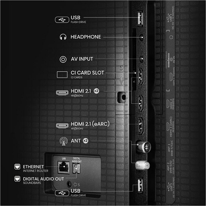 • DVB-T2/-C/-S2 Triple Tuner, 3x HDMI (HDMI 2.1), 2x USB, CI+, Digitaler Audio-Ausgang (S/PDIF), A/V-Eingang (Composite), LAN, WLAN & Bluetooth integriert