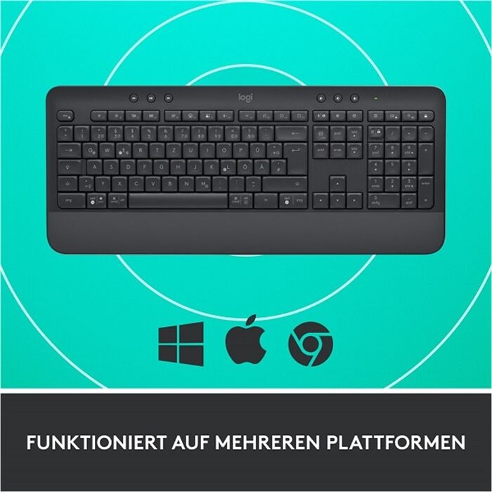 SIGNATURE K650 bietet verbesserte Tastenkombinationen und ist mit einer integrierten Handballenauflage ausgestattet: eine ideale Lösung für Ihre tägliche Arbeit. Holen Sie sich den Komfort, den Sie für viele Stunden Arbeit am Schreibtisch brauchen. Mit spritzwassergeschütztem und leicht zu reinigendem Design sowie einer Batterielaufzeit von bis zu 36 Monaten und ohne störende Kabel ist sie mühelos zu transportieren.