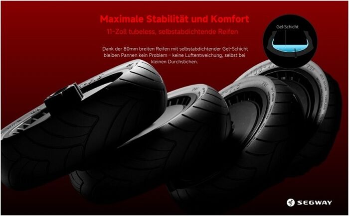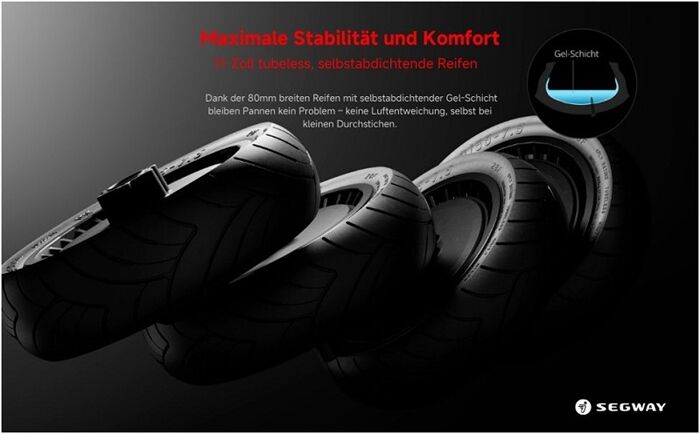 Für eine ruhige und stabile Fahrt ist der GT3 D mit 11-Zoll wartungsfreien, selbstversiegelnden schlauchlosen Reifen ausgestattet. Die hydraulische Doppelaufhängung vorne und die hintere hydraulische Schwingarmfederung sorgen für maximalen Komfort, selbst auf unebenen Straßen. Zusätzlich bietet das SegRide™-Stabilitätsverbesserungssystem mit Traktionskontrolle (TCS) besseren Grip und Kontrolle auf der Straße. Vorder- und hintere Scheibenbremsen ermöglichen schnelleres und zuverlässigeres Bremsen.