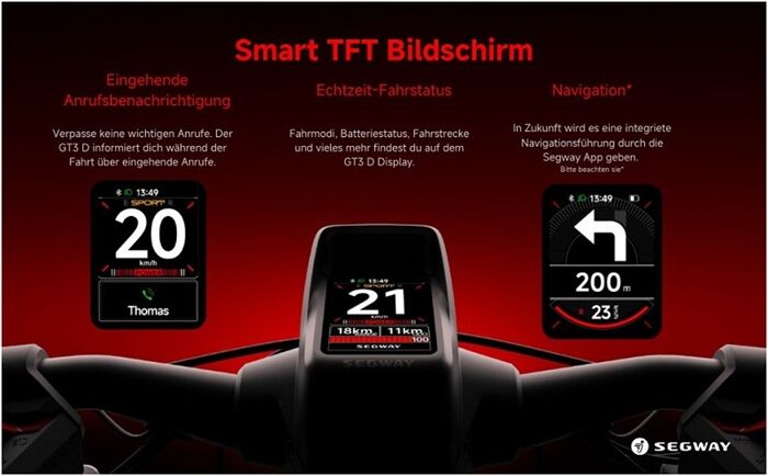 Der GT3 D ist mit einem vollfarbigen TFT-Dashboard ausgestattet, das integrierte Navigation**, Echtzeit-Fahrstatus-Updates und Benachrichtigungen für eingehende Anrufe bietet. Über die Segway Mobility App ist der eKickScooter mit Apple Find My kompatibel, sodass er jederzeit geortet werden kann. Zudem verfügt die App über das Segway AirLock-System, das eine Bluetooth-Entriegelung ermöglicht. Für ein individuell angepasstes Fahrerlebnis können Nutzer zwischen drei Fahrmodi – Eco, Standard und Race – sowie einem Walk-Modus wählen.