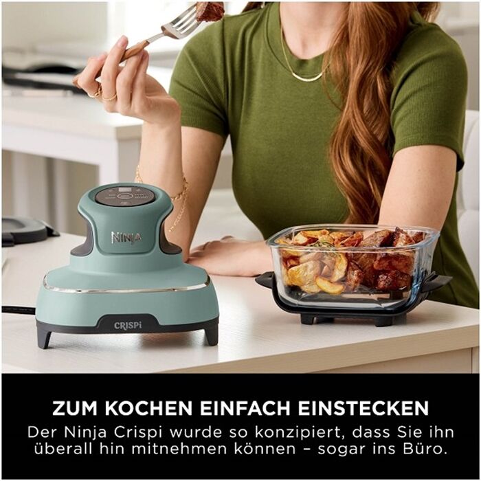 Lerne den Ninja CRISPi kennen – unsere revolutionäre, tragbare 4-in-1 Glas-Heißluftfritteuse. Leistungsstark wie eine große Heißluftfritteuse, und doch kompakt und tragbar. Ob zu Hause, im Büro oder unterwegs, mit dem CRISPi kannst du in jeder Situation ganz unkompliziert deine Lieblingsgerichte genießen. Sein handliches, tragbares Format macht es möglich: Einfach den leichten 1700-Watt-PowerPod auf einen der mitgelieferten Glasbehälter stecken, um jede Familienmahlzeit oder Einzelportion aufzupeppen.