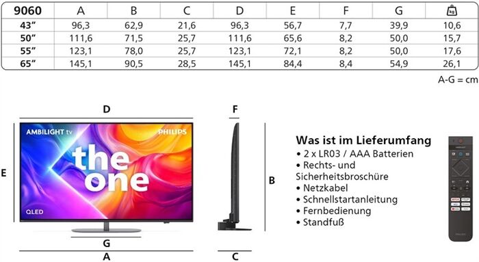 Bild-Eigenschaften - Bilddiagonale (cm): 108 - Bilddiagonale (Zoll): 43 - Anzahl Pixel, horizontal: 3840 - Anzahl Pixel, vertikal: 2160 - 120 Hz Technik - Spiele-Schaltung - Raumlichtanpassung: automatische Raumlichtanpassung - LED-Hintergrundbeleuchtung: LED-Hintergrundbeleuchtung - micro dimming - QLED-Technik - Quantum Dot Technik Elektronik-Eigenschaften - Dolby Vision - HDR 10+ - 4K Signalkonvertierung - Ultra HD - variable Bildwiederholfrequenz (VRR) - Auto Low Latency Mode (ALLM) - FreeSync Premium - HDCP 2.3 kompatibel - Sprachsteuerung - Bildschirmanzeigen (OSD) - Idealwert-Funktion Bild/Ton - Medienwiedergabe über USB - Netzwerkfähig Video-Teil - Flash-Speicher (GB): 8 Smart TV Ausstattung - Amazon Prime Video - Netflix - Amazon Alexa kompatibel - HbbTV - Online Apps erhältlich - Online Videodienste abrufbar - Smartp.-/Tabl. Inhalte kabellos streamen - Google Assistant kompatibel Videotext-Eigenschaften - Dekoder-Typ: Videotext-Dekoder - Anzahl Speicher-Seiten: 1000 Dolby-ProLogic-Dekoder - Dolby Atmos - Dolby-Digital-Dekoder (AC-3) Ton-Eigenschaften - Equalizer - autom. Lautstärkeanpassung - Lautsprecher-System: Breitband-Lautsprecher - Sinusleistung (W), gesamt: 20 - Sinusleistung (W), pro Kanal: 10 Empfangseigenschaften - UHDTV-Empfang - DVB-T2 - DVB-S2 - DVB-C - analoger Kabelempfang Wiedergabe-Standards - SmartMedia-Speicherkarte kompatibel - AAC kompatibel - AVI-Format kompatibel - WAV kompatibel - FLAC kompatibel - MP3 kompatibel - MPEG-1 kompatibel - MPEG-2 kompatibel - MPEG-4 kompatibel - H.264 kompatibel - H.265 kompatibel (HEVC) - JPEG-Format kompatibel - BMP-Format kompatibel - GIF-Format kompatibel - PNG-Format kompatibel - MKV kompatibel Anschlüsse - Kopfhörer-Anschluss - Digital-Optisch (OUT), Audio - Bluetooth-Schnittstelle - Common-Interface (CI+) - Anzahl Common-Interface (CI+): 1 - HDMI-Schnittstelle 2.1 - Anzahl HDMI-Schnittstellen (IN): 4 - eARC (Enhanced Audio Return Channel) - Anzahl USB-Schnittstellen: 2 - WLAN Ausstattung: WLAN integriert - Ethernet LAN Leistungsaufnahme - Angabe gem. EU-Verordnung 2019/2013 - Energieeffizienzklasse: Energieeffizienzklasse F - Energieeffizienzspektrum: Spektrum [A bis G] - Energieeffizienzklasse HDR-Wiedergabe: Energieeffizienzklasse HDR-Wiedergabe G - min. Netzspannung (V): 100 - max. Netzspannung (V): 240 - Energieverbrauch (kWh/1000h): 51 - Energieverbr. HDR-Wiedergabe (kWh/1000h): 114 - Öko-Schalter/Stromsparschaltung Gehäuse-Eigenschaften - Breite (cm): 96.2 - Höhe (cm): 62.9 - Tiefe (cm): 21.6 - Gewicht (kg): 10.56 - Breite ohne Standfuß (cm): 96.2 - Höhe ohne Standfuß (cm): 56.7 - Tiefe ohne Standfuß (cm): 7.7 - Gewicht ohne Standfuß (kg): 8.82 - Breite, Standfuß (cm): 39.9 - Wandmontage möglich - VESA kompatibel - Befestigungslöcher (H):: 100 - Befestigungslöcher (V):: 200 - Tisch- und Wandgerät - rückseitige Beleuchtung (Ambilight) Verpackungsangaben - Breite mit Verpackung (cm): 107 - Höhe mit Verpackung (cm): 74 - Tiefe mit Verpackung (cm): 15 - Gewicht mit Verpackung (kg): 13.7