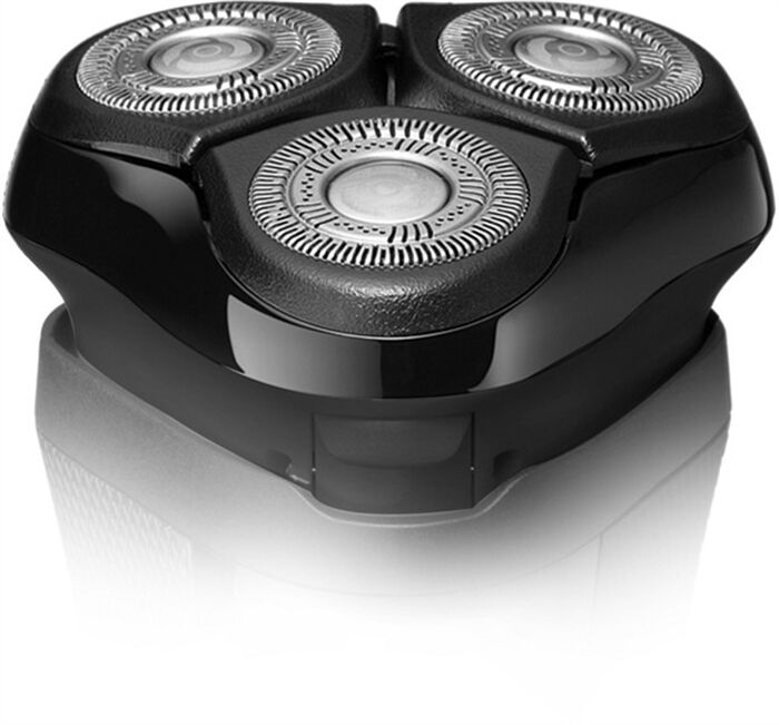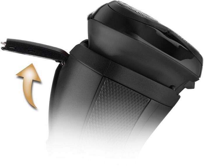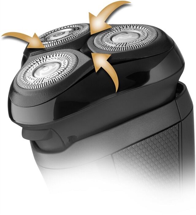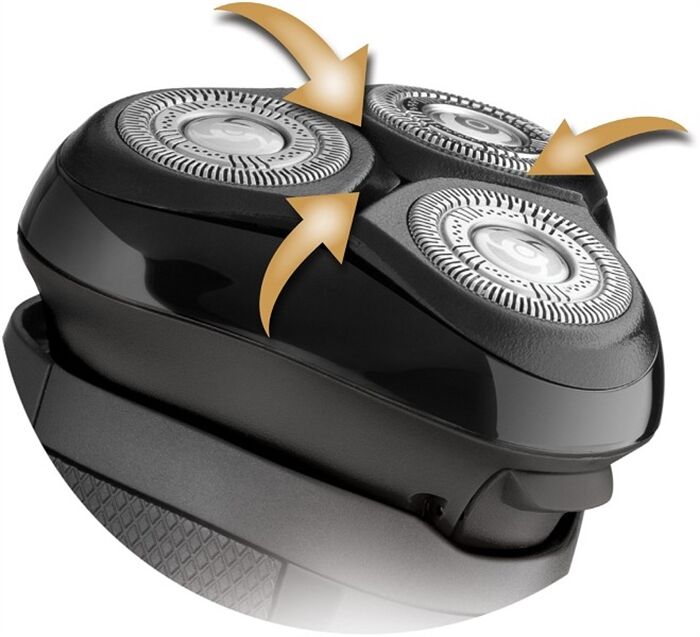 Der Scherkopf des R4 Style Series Rotationsrasierers R3600 ist frei beweglich für maximalen Hautkontakt. Zudem passen sich die Scherköpfe perfekt den Gesichtskonturen an. Die DualTrack Klingen schneiden auch tiefliegende und längere Haare ohne Probleme.