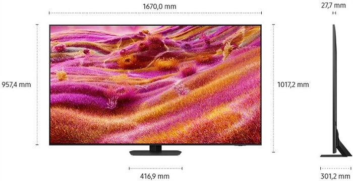 Bild-Eigenschaften - Bilddiagonale (cm): 189 - Bilddiagonale (Zoll): 75 - Anzahl Pixel, horizontal: 3840 - Anzahl Pixel, vertikal: 2160 - Betrachtungswinkel, horizontal (Grad): 178 - Betrachtungswinkel, vertikal (Grad): 178 - HDR 10+ Adaptive - QLED-Technik - Quantum Dot Technik - 4K Signalkonvertierung - 120 Hz Technik - Spiele-Schaltung - LED-Hintergrundbeleuchtung: Mini-LED-Hintergrundbeleuchtung - micro dimming - Multi-PiP Elektronik-Eigenschaften - Ultra HD - Auto Low Latency Mode (ALLM) - FreeSync Premium Pro - Sprachsteuerung - Bildschirmanzeigen (OSD) - mehrsprachiges Menü - elek. menügest. TV-Programmführung (EPG) - Datenverbindung zwischen Video und TV - Idealwert-Funktion Bild/Ton - USB-Aufnahmefunktion - Medienwiedergabe über USB - Netzwerkfähig Video-Teil - zeitversetzte Wiedergabe Smart TV Ausstattung - Amazon Prime Video - Netflix - Amazon Alexa kompatibel - Google Assistant kompatibel - HbbTV - DLNA Standard - Web Browser - Online Apps erhältlich - Online Videodienste abrufbar - steuerbar über Smartphone/Tablet - TV-Signal-Streaming - Smartp.-/Tabl. Inhalte kabellos streamen Videotext-Eigenschaften - Dekoder-Typ: Videotext-Dekoder Dolby-ProLogic-Dekoder - Dolby Atmos - Dolby-Digital-Dekoder (AC-3) Ton-Eigenschaften - Lautsprecher-System: Breitband-Lautsprecher - integrierter Bass/Subwoofer - Sinusleistung (W), gesamt: 60 Empfangseigenschaften - UHDTV-Empfang - DVB-T2 Twin-Tuner - DVB-S2 Twin-Tuner - DVB-C Twin-Tuner - analoger Kabelempfang Wiedergabe-Standards - H.264 kompatibel - H.265 kompatibel (HEVC) Anschlüsse - Digital-Optisch (OUT), Audio - Common-Interface (CI+) - Anzahl Common-Interface (CI+): 1 - HDMI-Schnittstelle: HDMI-Schnittstelle 2.1 - Anzahl HDMI-Schnittstellen (IN): 4 - eARC (Enhanced Audio Return Channel) - Anzahl USB-Schnittstellen: 2 - WLAN Ausstattung: WLAN integriert - Bluetooth-Schnittstelle - Ethernet LAN Leistungsaufnahme - Angabe gem. EU-Verordnung 2019/2013 - Energieeffizienzklasse: Energieeffizienzklasse E - Energieeffizienzspektrum: Spektrum [A bis G] - Energieeffizienzklasse HDR-Wiedergabe: Energieeffizienzklasse HDR-Wiedergabe G - Leistungsaufnahme, Stand-By (W): 0.5 - Energieverbrauch (kWh/1000h): 101 - Energieverbr. HDR-Wiedergabe (kWh/1000h): 253 Gehäuse-Eigenschaften - Breite (cm): 167 - Höhe (cm): 101.72 - Tiefe (cm): 30.12 - Gewicht (kg): 39.7 - Breite ohne Standfuß (cm): 167 - Höhe ohne Standfuß (cm): 95.74 - Tiefe ohne Standfuß (cm): 2.77 - Gewicht ohne Standfuß (kg): 34.1 - Breite, Standfuß (cm): 41.69 - Tiefe, Standfuß (cm): 30.12 - Wandmontage möglich - VESA kompatibel - Befestigungslöcher (H):: 400 - Befestigungslöcher (V):: 400 - Tisch- und Wandgerät Verpackungsangaben - Breite mit Verpackung (cm): 188.4 - Höhe mit Verpackung (cm): 111.8 - Tiefe mit Verpackung (cm): 19.1 - Gewicht mit Verpackung (kg): 50.2