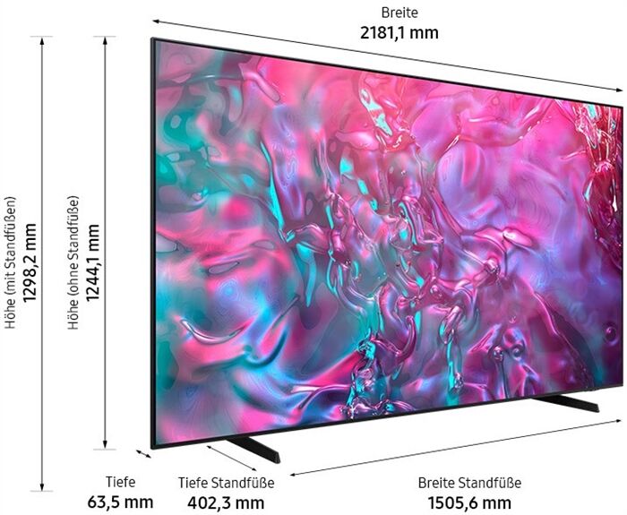 Bild-Eigenschaften - Bilddiagonale (cm): 247 - Bilddiagonale (Zoll): 98 - 16:9 Format - HDR 10+ - 4K Signalkonvertierung - 120 Hz Technik - Spiele-Schaltung - LED-Hintergrundbeleuchtung: LED-Hintergrundbeleuchtung - micro dimming - Multi-PiP Elektronik-Eigenschaften - Auto Low Latency Mode (ALLM) - FreeSync Premium - Sprachsteuerung - Bildschirmanzeigen (OSD) - mehrsprachiges Menü - elek. menügest. TV-Programmführung (EPG) - Datenverbindung zwischen Video und TV - Idealwert-Funktion Bild/Ton - Medienwiedergabe über USB - Netzwerkfähig Smart TV Ausstattung - Amazon Prime Video - Netflix - Amazon Alexa kompatibel - Google Assistant kompatibel - HbbTV - DLNA Standard - Web Browser - Online Apps erhältlich - Online Videodienste abrufbar - steuerbar über Smartphone/Tablet - Smartp.-/Tabl. Inhalte kabellos streamen Ton-Eigenschaften - Lautsprecher-System: Breitband-Lautsprecher - Sinusleistung (W), gesamt: 20 Empfangseigenschaften - HD+ kompatibel - UHDTV-Empfang - DVB-T2 - DVB-S2 - DVB-C - analoger Kabelempfang Wiedergabe-Standards - H.264 kompatibel - H.265 kompatibel (HEVC) Anschlüsse - Digital-Optisch (OUT), Audio - Common-Interface (CI+) - Anzahl Common-Interface (CI+): 1 - Anzahl HDMI-Schnittstellen (IN): 3 - eARC (Enhanced Audio Return Channel) - Anzahl USB-Schnittstellen: 2 - WLAN Ausstattung: WLAN integriert - Bluetooth-Schnittstelle - Ethernet LAN Leistungsaufnahme - Angabe gem. EU-Verordnung 2019/2013 - Energieeffizienzklasse: Energieeffizienzklasse F - Energieeffizienzspektrum: Spektrum [A bis G] - Energieeffizienzklasse HDR-Wiedergabe: Energieeffizienzklasse HDR-Wiedergabe G - min. Netzspannung (V): 220 - max. Netzspannung (V): 240 - Energieverbrauch (kWh/1000h): 178 - Energieverbr. HDR-Wiedergabe (kWh/1000h): 498 - Öko-Schalter/Stromsparschaltung Gehäuse-Eigenschaften - Breite (cm): 218.11 - Höhe (cm): 129.82 - Tiefe (cm): 40.23 - Gewicht (kg): 53.4 - Breite ohne Standfuß (cm): 218.11 - Höhe ohne Standfuß (cm): 124.41 - Tiefe ohne Standfuß (cm): 6.35 - Gewicht ohne Standfuß (kg): 51.8 - Tiefe, Standfuß (cm): 40.23 - Abstand zwischen den Standfüßen (cm): 150.56 - Wandmontage möglich - VESA kompatibel - Befestigungslöcher (H):: 600 - Befestigungslöcher (V):: 400 - Tisch- und Wandgerät Verpackungsangaben - Breite mit Verpackung (cm): 236.9 - Höhe mit Verpackung (cm): 140.4 - Tiefe mit Verpackung (cm): 27.5 - Gewicht mit Verpackung (kg): 76