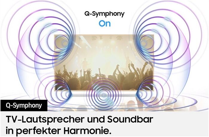 Q-Symphony ist eine Samsung-exklusive Technologie, die das gleichzeitige Abspielen von TV-Lautsprechern und Soundbar ermöglicht. Daraus resultiert eine beeindruckende Soundsynergie. In der aktuellen Version bietet Q-Symphony einen für alle Kanäle optimierten Sound. Dahinter steckt eine KI-Technologie, die das eingehende Audiomaterial neu mastert.