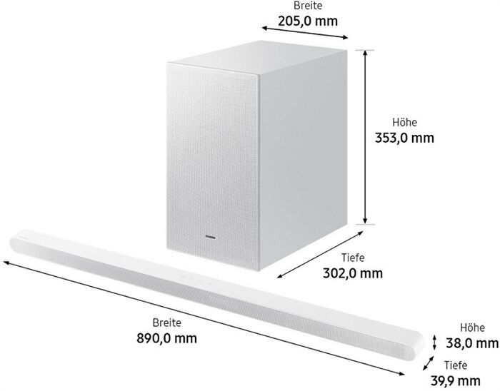 Bestehend aus: - Soundbar - Subwoofer Leistungs-/Elektronikeigenschaften - Anzahl Kanäle: 3.1 - DTS:X-Decoder (DTS:X) - virtueller Surround-Sound - Dolby Atmos - Dolby-Digital-Plus kompatibel - Digital-Theater-Systems (DTS) kompatibel - Dolby-TrueHD kompatibel - Anzahl vorprogrammierter Surround-Modi: 4 - Datenverbindung zwischen Video und TV - AAC + MP3 Standard - WAV kompatibel - OGG-Vorbis kompatibel - FLAC kompatibel - Apple Lossless (ALAC) kompatibel - AIFF kompatibel - Sinusleistung (W), gesamt: 250 Bedienung - Amazon Alexa kompatibel - Google Home kompatibel - Chromecast (Google Cast) - Sprachsteuerung möglich - Fernbedienung - steuerbar über Smartphone/Tablet - Funktionserweiterung über Apps - Night-Modus (angepasste Effektlautstärke) Lautsprecher-System: - Anzahl der eingebauten Lautsprecher: 6 - Wandmontage möglich Subwoofer - Aktiv-Subwoofer - kabellose Funk-Signalübertragung - Subwoofer: Sinusleistung (W): 160 Anschlüsse - Anzahl Digital-Optisch (IN): 1 - HDMI-Schnittstelle - AirPlay fähig - WLAN-Schnittstelle - Bluetooth-Schnittstelle Leistungsaufnahme - Leistungsaufnahme (W): 54 - Leistungsaufnahme, Stand-By (W): 1 Gehäuse-Eigenschaften - Breite, Lautsprecher (cm): 89 - Höhe, Lautsprecher (cm): 3.8 - Tiefe, Lautsprecher (cm): 3.99 - Gewicht, Lautsprecher (kg): 0.84 - Breite (cm): 20.5 - Höhe (cm): 35.3 - Tiefe (cm): 30.2 - Gewicht (kg): 5.9 Verpackungsangaben - Breite mit Verpackung (cm): 96.7 - Höhe mit Verpackung (cm): 27.2 - Tiefe mit Verpackung (cm): 44.3 - Gewicht mit Verpackung (kg): 9.2 Farben - Gehäuse-Farben: weiß