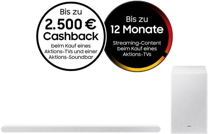 • * Aktions-TV mit -Soundbar kaufen und satten Cashback sichern. Aktionszeitraum: 19.01.2026 bis 10.05.2026. Teilnahmebedingungen, Aktionsgeräte mit länderspezifischem Modell-Code sowie modellabhängige Cashbacks unter: samsung.de/mixmatch