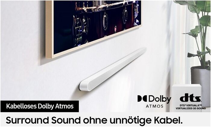 Samsung Soundbars unterstützen die objektbasierte Audiotechnologie Dolby Atmos® kabellos, d. h., ohne dass ein Kabel oder zusätzlicher Dongle angeschlossen werden muss. Erlebe somit beeindruckenden Surround Sound von Filmen und Musik ganz einfach über dein WLAN und freu dich über den aufgeräumten Look in deinem Heimkino.