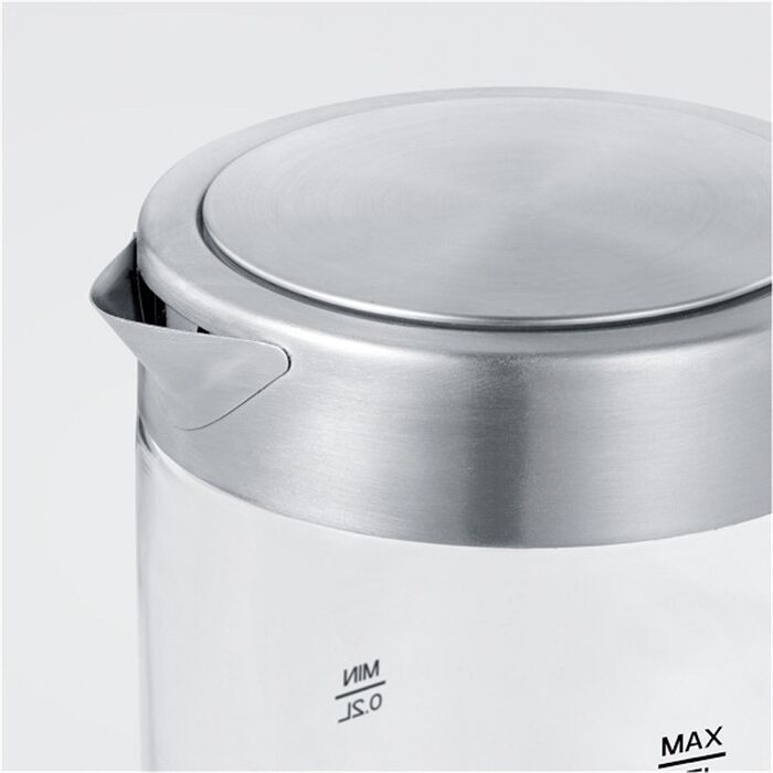 Leistungseigenschaften - Leistung (W): 1100 - Fassungsvermögen (l): 0.5 - Dampfstopp-Automatik - verdecktes Heizelement - Edelstahl-Abdeckung der Heizschlange - Überhitzungsschutz Bedienung - Kabel: kabellos mit separatem Aufheizsockel - Aufheizsockel ohne Kannenfixierung - Filter-Typ: herausnehmbarer Kalkfilter - autom. Deckelöffnung per Knopfdruck - Wasserstandsanzeige: beidseitige Wasserstandsanzeige Gehäuse-Eigenschaften - Breite (cm): 17 - Höhe (cm): 18 - Tiefe (cm): 10.5 - Gewicht (kg): 0.79 - Ausgießzotte: Edelstahl-Ausgießer - Gehäuse-Material: Topf aus Glas - BPA frei - Rutschsicherung Verpackungsangaben - Breite mit Verpackung (cm): 18 - Höhe mit Verpackung (cm): 23 - Tiefe mit Verpackung (cm): 13 - Gewicht mit Verpackung (kg): 1.07 Farben - Gehäuse-Farben: edelstahl