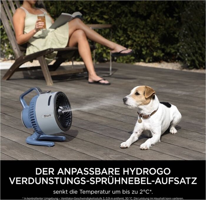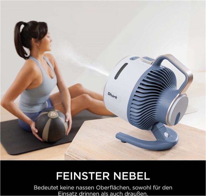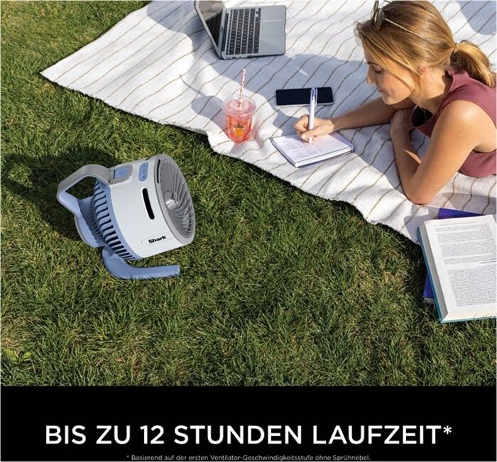 • Nimm den Sprühnebel mit – drinnen oder draußen: Dank der HydroGo-Technologie von Shark, die ultrafeine Tröpfchen erzeugt, kannst du erfrischenden Sprühnebel sowohl drinnen als auch draußen genießen – für vollständige Kühlung, wo immer du bist