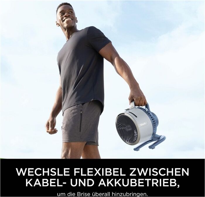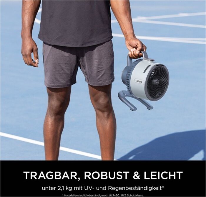 Wir präsentieren den Shark Flex Breeze HydroGo – den kraftvollen, tragbaren Ventilator, der sowohl drinnen als auch draußen mit Sprühnebel kühlt. Egal, ob du dich zu Hause abkühlst, ein Picknick im Park genießt, unter den Sternen campst oder beim Schulsportfest bist – der Shark Flex Breeze HydroGo lässt dich die Brise mitnehmen und überall einen erfrischenden Nebel erzeugen. Erfrischender Sprühnebel ohne nasse Oberflächen: Die HydroGo-Technologie von Shark erzeugt ultrafeine Tröpfchen, sodass du einen erfrischenden Sprühnebel drinnen und draußen genießen kannst, ohne nasse Oberflächen zu hinterlassen. Mit dem integrierten 150-ml-Wassertank war die Kühlung noch nie so einfach. Leicht und einfach zu tragen: Kompakt und mit weniger als 2,1 kg Gewicht ist der Shark FlexBreeze HydroGo der perfekte Begleiter für schnelle Kühlung unterwegs. Mit einer kabellosen Laufzeit von bis zu 12 Stunden bei der ersten Geschwindigkeitsstufe, ohne Sprühnebel, bleibst du länger erfrischt, ohne nachladen zu müssen. Passe deine Kühlung individuell an: Wähle aus fünf Geschwindigkeitsstufen, zwei intelligenten Brisen-Modi, kontinuierlichem Sprühnebel oder Intervall-Sprühnebel. Bei maximaler Geschwindigkeitsstufe kann der Luftstrom bis zu 20 m erreichen. Mit einer vertikalen Neigung von 45° sind deine Kühlbedürfnisse bestens abgedeckt. Zusätzlich kannst du aus einer Reihe von Zubehörteilen (separat erhältlich) wählen – darunter eine Powerbank, ein Autoladegerät, ein Standfuß und eine Tragetasche – und dein Set für jede Gelegenheit anpassen. Farblich cool Der Shark FlexBreeze HydroGo ist in einer Auswahl eleganter, moderner Farben erhältlich, die jedes Umfeld ergänzen, damit du stilvoll cool bleibst. Robust draußen, leise drinnen: Mit einer Regenbeständigkeit nach IPX5 und UV-Beständigkeit* ist der Shark Flex Breeze HydroGo robust genug für den Einsatz im Freien. Drinnen sorgt der leise Betrieb für minimale Störungen – perfekt zum Schlafen oder Arbeiten von zu Hause. Im Lieferumfang enthalten: Shark Ventilator, Ladekabel * Materialien sind UV-beständig nach UL746C.B42