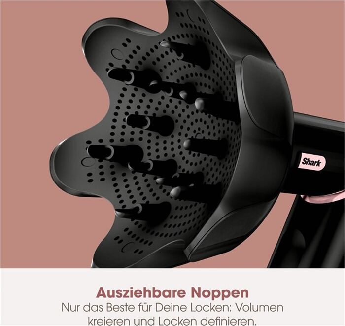 Diffusor: Nur das Beste für Ihre Locken. Der Diffusor von Shark bietet Ihnen ausziehbare Noppen für schnelles, gleichmäßiges Trocknen vom Haaransatz bis in die Spitzen. Benutzen Sie den Hebel, um die Noppen für einen individuellen Luftstrom auszufahren oder einzufahren. Ideal für gewelltes, lockiges und coily Haar.