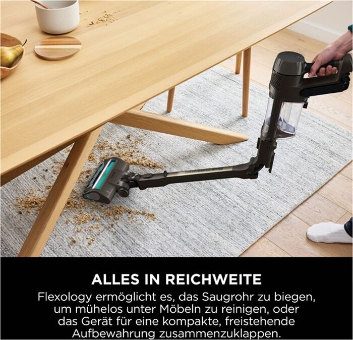 Alles in Reichweite: Flexology ermöglicht es dir, das Saugrohr zu biegen, um mühelos unter Möbeln zu reinigen, oder es für eine kompakte, freistehende Aufbewahrung zusammenzuklappen.