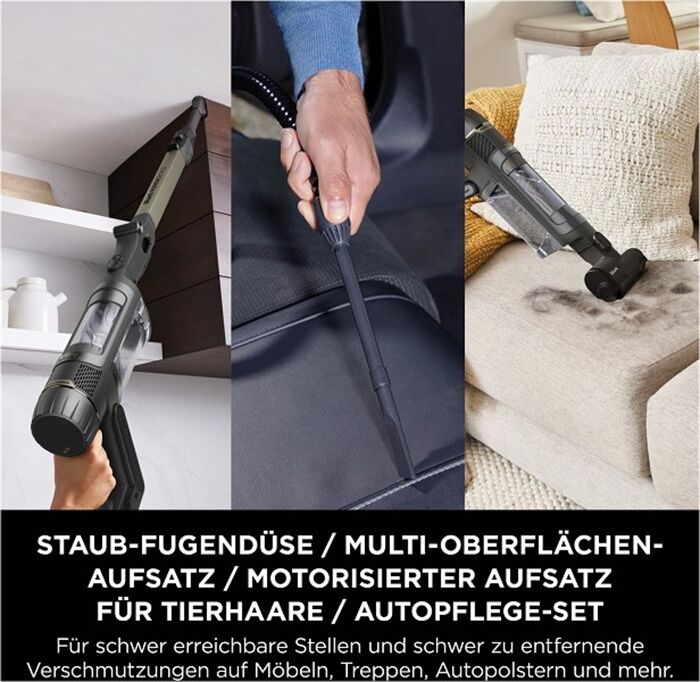 • Lieferumfang: Staub-Fugendüse, motorisierter Tierhaar-Aufsatz, Multi-Oberflächen-Aufsatz, Reinigungs-Set und Zubehör-Station mit 2 Steckplätzen