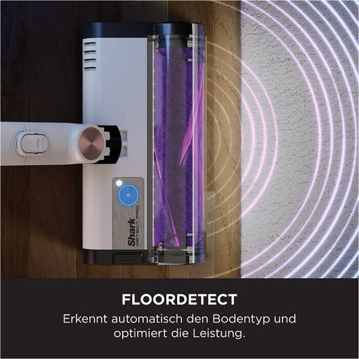 • FloorDetect (Bodenerkennung): Erkennt automatisch den Bodentyp und optimiert die Leistung, indem die Rotationsbürstengeschwindigkeit verdoppelt wird, um Teppiche und Teppichböden effizient zu reinigen.