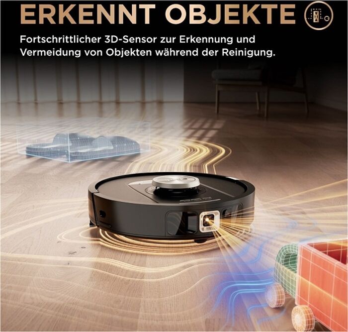 Präzise Kartenerstellung der Wohnung: Die 360°-LiDAR-Vision erstellt schnell und präzise eine Karte von jedem Zentimeter Ihres Zuhauses, damit Ihr Roboter methodisch reinigen kann, indem er Objekte in seinem Weg erkennt und vermeidet, Tag und Nacht, und sich an die täglichen Veränderungen in Ihrem Zuhause anpasst.