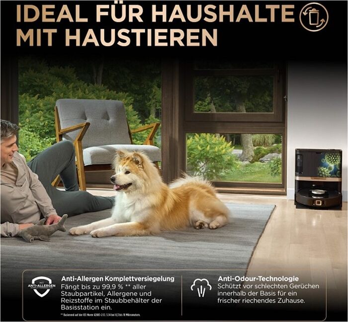 Perfekt für Haushalte mit Haustieren: Die Kombination aus leistungsstarker Saugkraft und Anti-Hair-Wrap verhindert, dass sich Tierhaare um die selbstreinigende Bürstenrolle wickeln. Nach jeder Reinigung fängt der Roboter Tierhaare und Hautschuppen in der Basisstation auf.