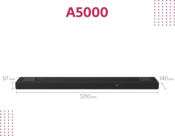 Bestehend aus: - Soundbar Leistungs-/Elektronikeigenschaften - Anzahl Kanäle: 5.1 - Anzahl Dolby-Atmos-Signal-Kanäle: 2 - Internet-Musikwiedergabe - integrierter Bass/Subwoofer - virtueller Surround-Sound - Dolby-Digital-Dekoder (AC-3) - Dolby-TrueHD-Dekoder - Dolby Atmos - DLNA Standard - Dynamikoptimierung f. komprimierte Musik - kompatibel für 4K Auflösung - HDR-Wiedergabe - Hi-Res Audio - DSD kompatibel - Musikleistung (W), gesamt: 450 Bedienung - Chromecast (Google Cast) - Fernbedienung Anschlüsse - Anzahl Audio (IN): 1 - Anzahl Digital-Optisch (IN): 1 - Anzahl HDMI-Schnittstellen (IN): 1 - Anzahl HDMI-Schnittstellen (OUT): 1 - USB-Schnittstelle - WLAN-Schnittstelle - Ethernet LAN - Bluetooth-Schnittstelle Leistungsaufnahme - Leistungsaufnahme (W): 86 Gehäuse-Eigenschaften - Breite, Lautsprecher (cm): 121 - Höhe, Lautsprecher (cm): 6.7 - Tiefe, Lautsprecher (cm): 14 - Gewicht, Lautsprecher (kg): 6.1 Verpackungsangaben - Breite mit Verpackung (cm): 127.5 - Höhe mit Verpackung (cm): 22.2 - Tiefe mit Verpackung (cm): 17.2 - Gewicht mit Verpackung (kg): 10 Farben - Gehäuse-Farben: schwarz
