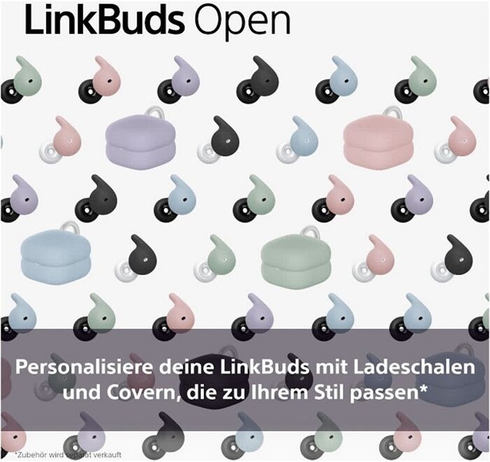 LinkBuds Open gibt es in drei Farben – Schwarz, Weiss und Violett. Und sie lassen sich individuell gestalten! Für die Kopfhörer und das Case sind Hüllen in Pink, Blau, Grün, Violett und Schwarz erhältlich, sodass Sie sie genau an Ihren Look anpassen können.*
