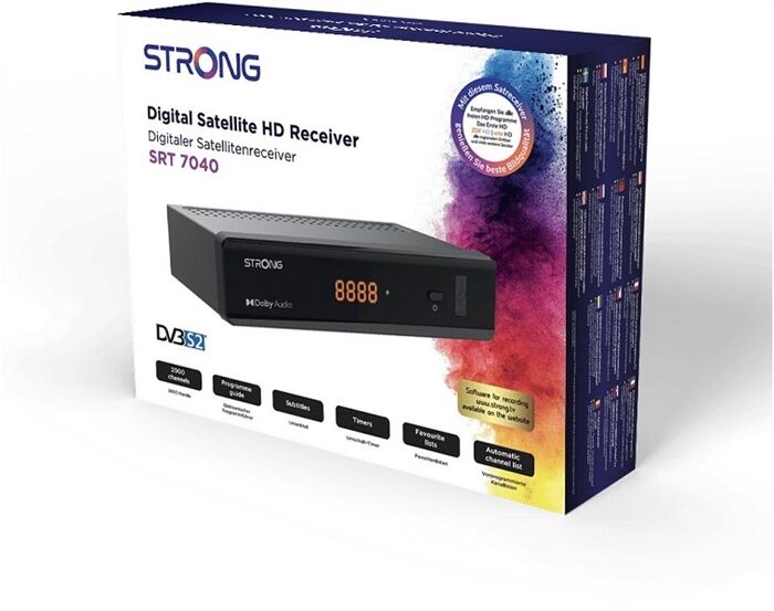 Genießen Sie Ihr TV-Erlebnis mit dem digitalen High Definition-Satellitenreceiver SRT 7040. Die einfache Bedienung, das benutzerfreundliche Menü und die komfortablen Funktionen machen den Receiver zu einem zuverlässigen Partner für Ihr Home Entertainment. Außerdem können Sie digitales Free-To-Air-TV und Radio über Satelliten wiedergeben. Darüber hinaus punktet der Receiver mit vielen weiteren nützlichen Funktionen, wie z.B. schnelle Sendersuche, Favoritenlisten zur individuellen Sortierung von TV- und Radioprogrammen, Buchung von Sendungen direkt aus dem Elektronischen Programmführer (EPG), Teletext und vieles mehr gehören zum Standard eines STRONG Receivers.